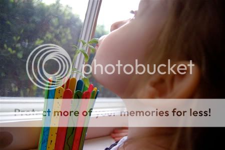 After the party, we cleaned up a bit, put Clara down for a nap, and Emily asked if we could do a little project. Inspired by some lanterns we had used to decorate for the party, we made a festive planter from a baby food jar and some colored popsicle sticks. Surely, this little tomato plant must be feeling the love....