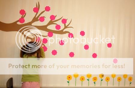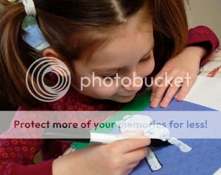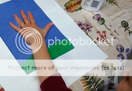 I tore a piece of green paper to form the grass for the picture, and invited Emily over to glue it down on the blue background. I didn't have to twist her arm!