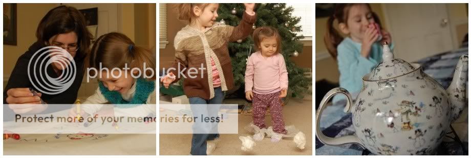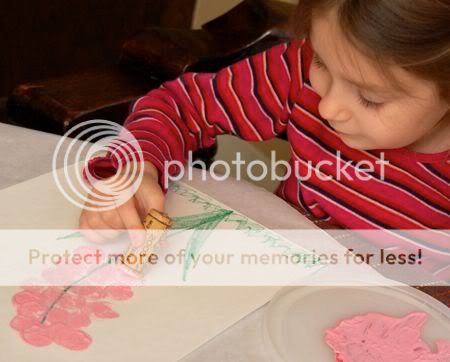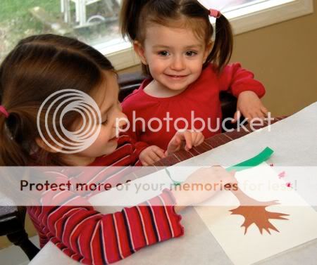 Next, Emily took her job as "big sister" quite seriously, and put little dots of glue where the blossoms will go.